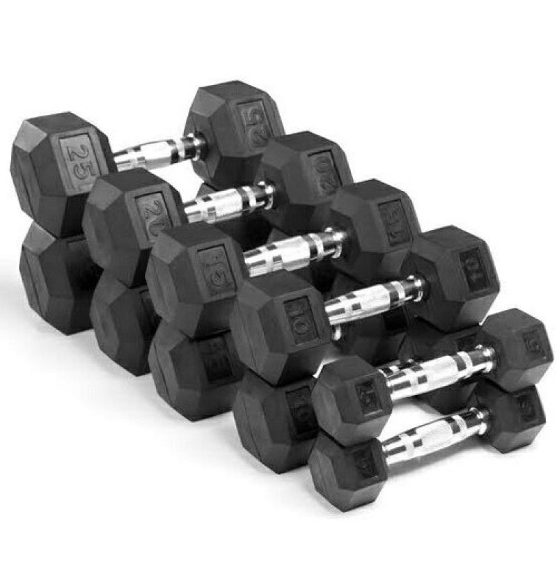 | The Premium Quality Rubber Coated Professional HEXAGONAL Fixed Weight DUMBBELL have a Tough & Sturdy design and comfortable feel, These DUMBBELLS are the ideal training aid for all types of workouts. Some people prefer to use dumbbells for aerobic training to increase the resistance to regular cardio exercises whilst others do dumbbell exercises can enhance muscle strength of various parts of the body. The design of the Hex Dumbbells as the name suggests HEXAGONAL so will not roll away when placed on a flat surface. This is particularly useful if you plan on doing interval training and need to alternate weights quickly. |